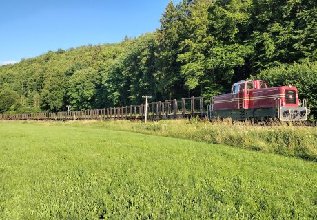 Zum Einsatz kommt unsere formschöne Rarität V70, die 1959 von Gmeinder für die Bregtalbahn geliefert wurde, in Kombination mit einem NE81-Steuerwagen.