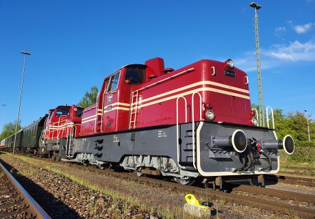 Zum Einsatz kommt unsere formschöne Rarität V70, die 1959 von Gmeinder für die Bregtalbahn geliefert wurde, in Kombination mit einem NE81-Steuerwagen.