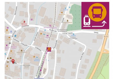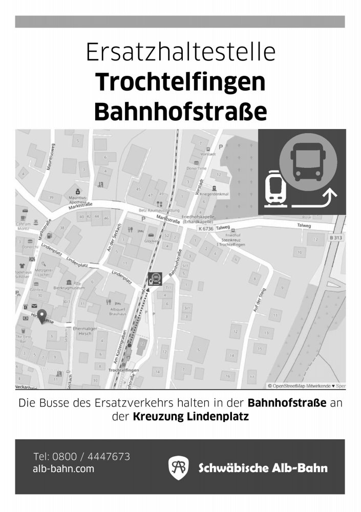 Die Ersatzbus-Haltestelle befindet sich direkt vor dem Bahnsteig an der Trochtelfinger Straße.